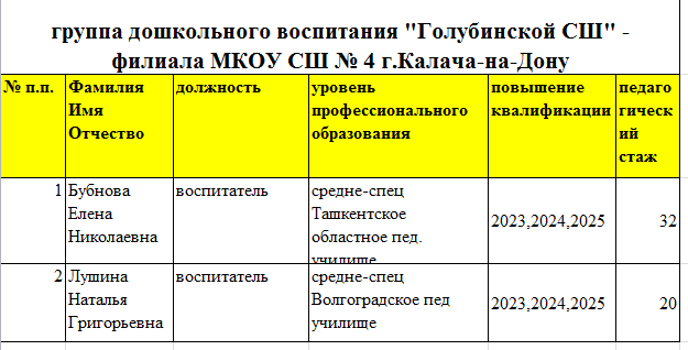 Сведения о педагогических работников МКОУ СШ №4 г.Калача-на-Дону в 2025-2026 учебном году (ДОУ)